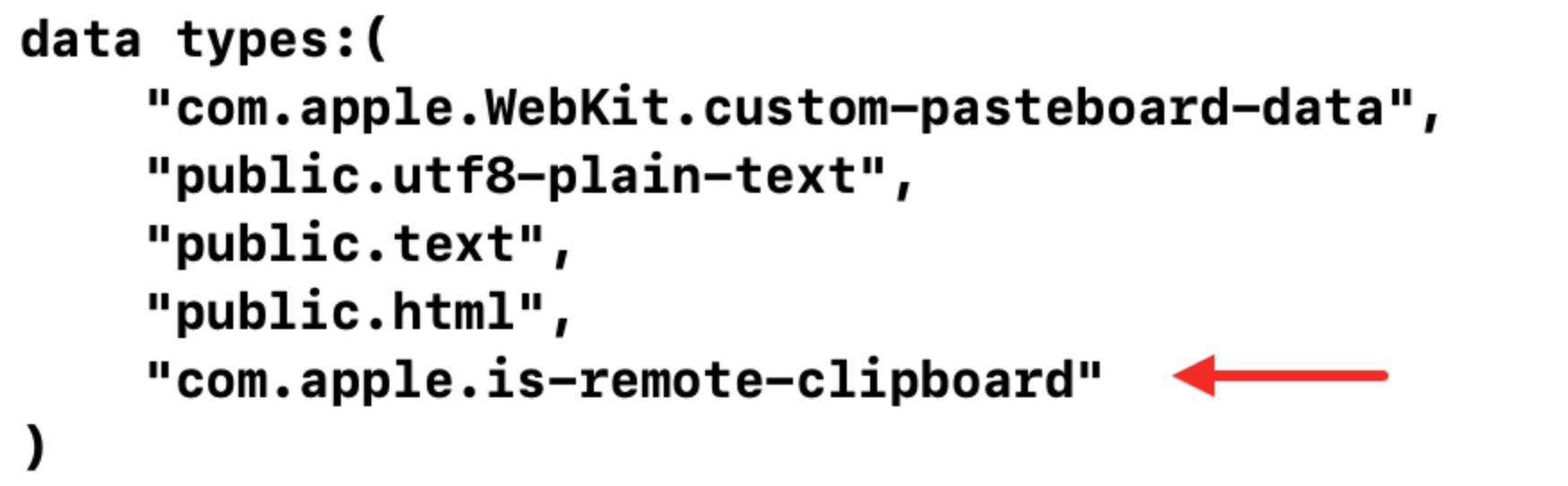 给这个函数打了一个断点, 发现在读取剪贴板类型时, 会调用这个接口, 而且更妙的是, 如果远程剪贴板, 那么类型列表中会有这样一个类型com.apple.is-remote-clipboard